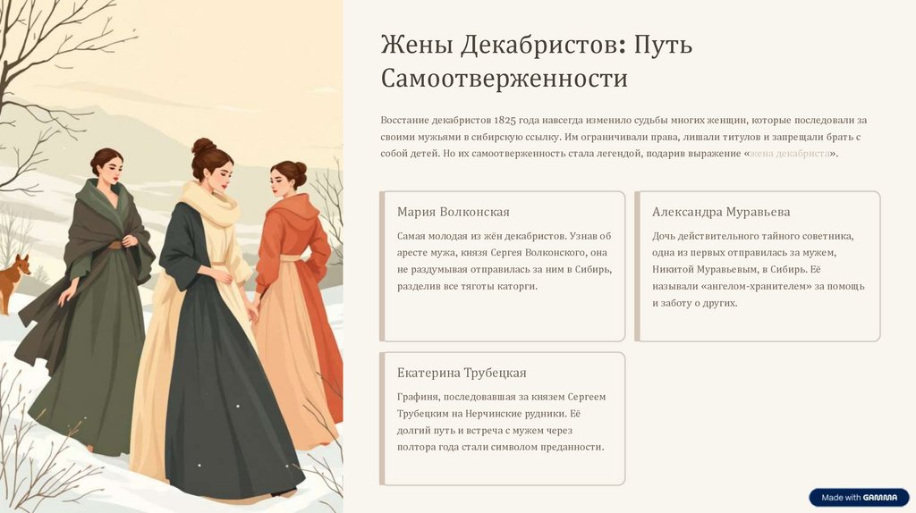 своими мужьями в сибирскую ссылку. Им ограничивали права, лишали титулов и запрещали брать с