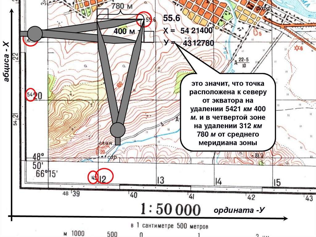 карте) относительно двух взаимноперпендикулярных осей Х и Y (рис.). Абсцисса Х и ордината Y