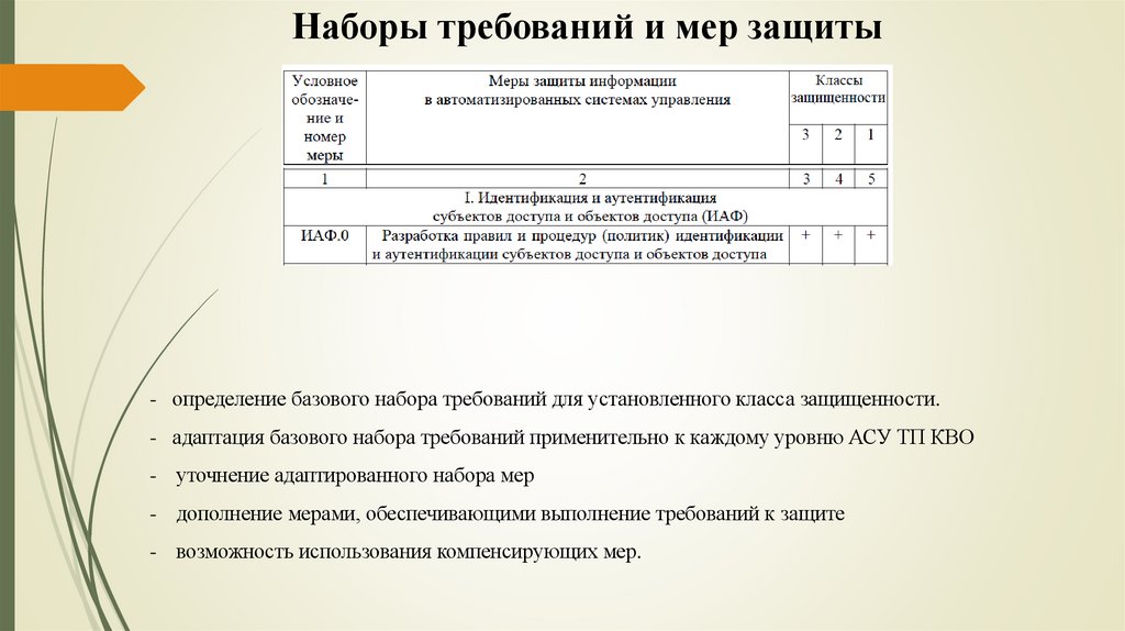 Наборы требований и мер защиты- определение базового набора требований для установленного класса защищенности.