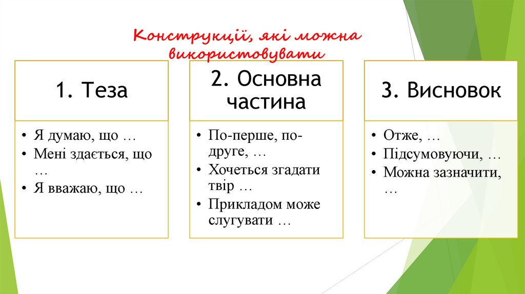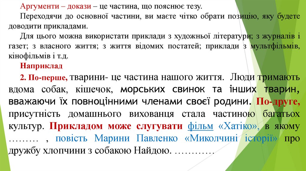 Аргументи – докази – це частина, що пояснює тезу.Переходячи до основної частини, ви маєте чітко обрати позицію, яку будете