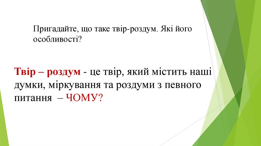 Пригадайте, що таке твір-роздум. Які йогоособливості?