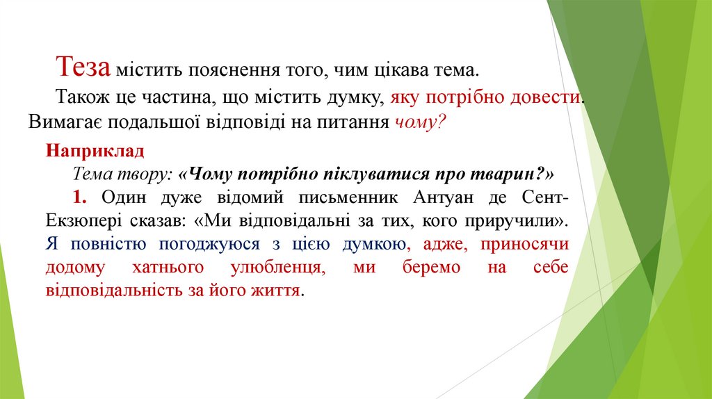 Теза містить пояснення того, чим цікава тема.Також це частина, що містить думку, яку потрібно довести.