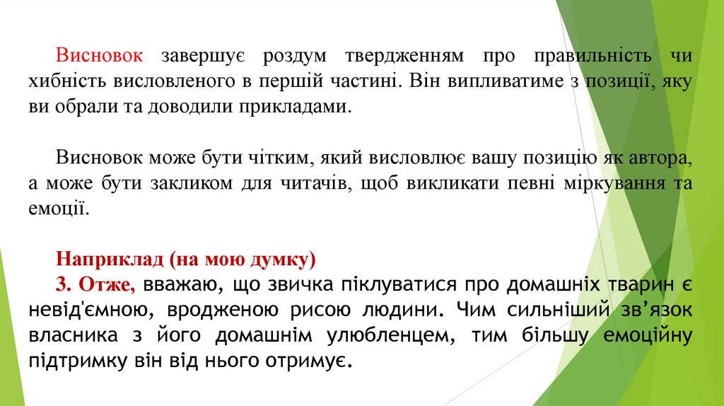 Висновок завершує роздум твердженням про правильність чихибність висловленого в першій частині. Він випливатиме з позиції, яку