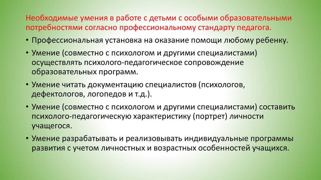Необходимые умения в работе с детьми с особыми образовательнымипотребностями согласно профессиональному стандарту педагога.