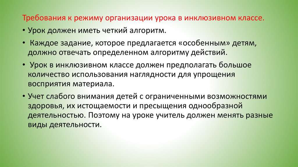 Требования к режиму организации урока в инклюзивном классе.• Урок должен иметь четкий алгоритм.