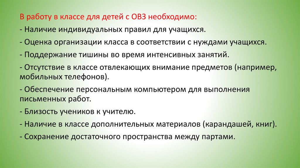 В работу в классе для детей с ОВЗ необходимо:- Наличие индивидуальных правил для учащихся.