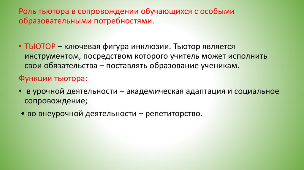 • ТЬЮТОР – ключевая фигура инклюзии. Тьютор является