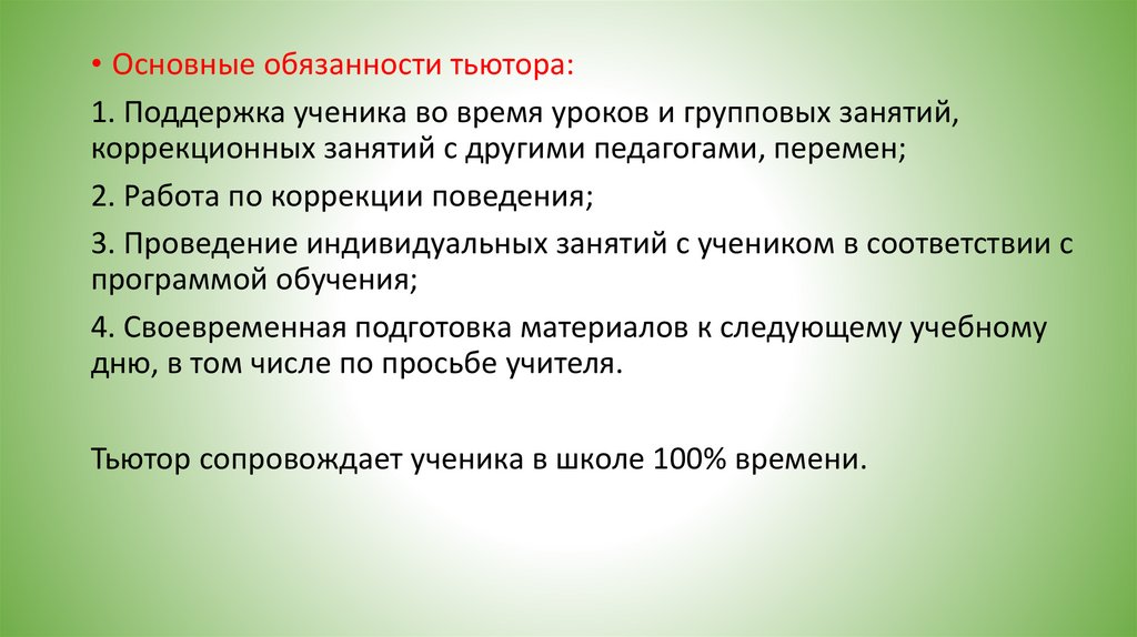 • Основные обязанности тьютора:1. Поддержка ученика во время уроков и групповых занятий,