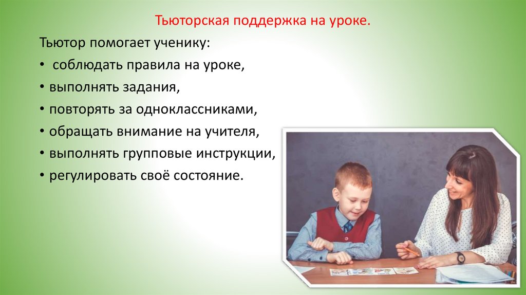 Тьюторская поддержка на уроке.Тьютор помогает ученику:
