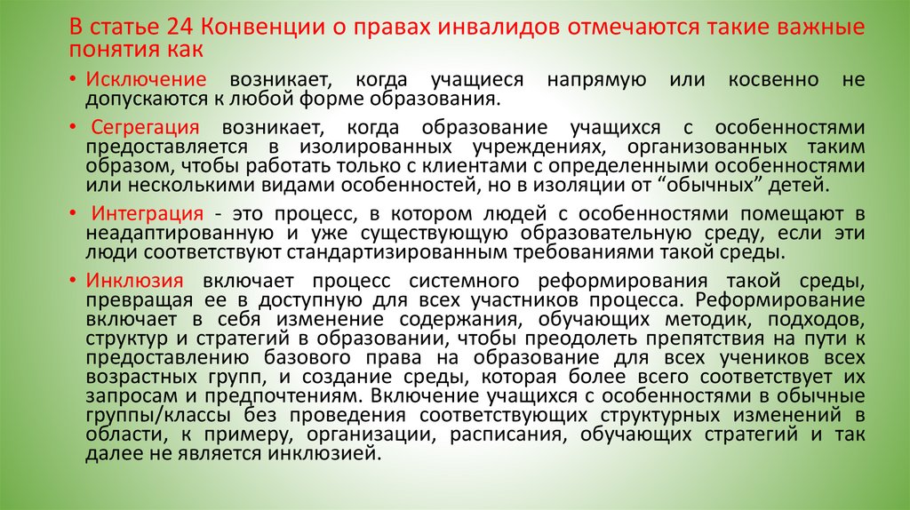 В статье 24 Конвенции о правах инвалидов отмечаются такие важныепонятия как
