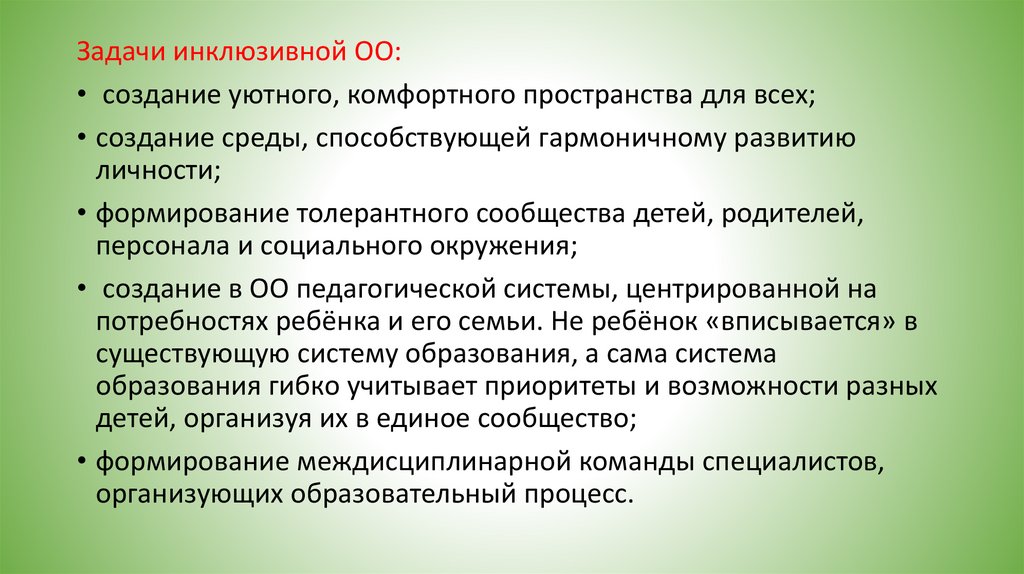 Задачи инклюзивной ОО:• создание уютного, комфортного пространства для всех;