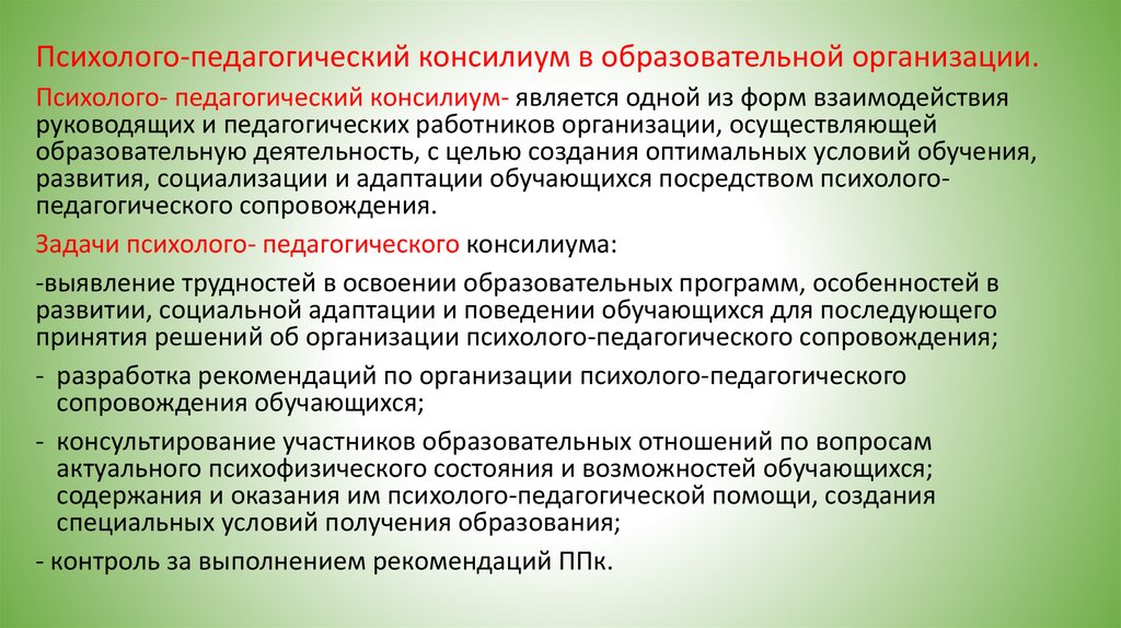 Психолого-педагогический консилиум в образовательной организации.Психолого- педагогический консилиум- является одной из форм взаимодействия