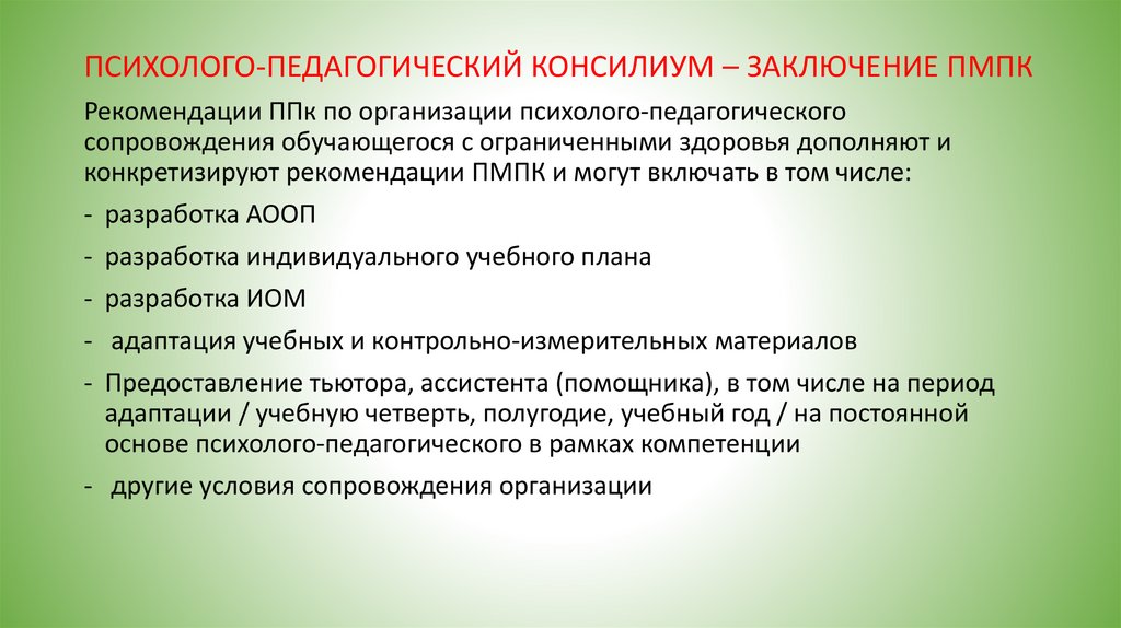 ПСИХОЛОГО-ПЕДАГОГИЧЕСКИЙ КОНСИЛИУМ – ЗАКЛЮЧЕНИЕ ПМПКРекомендации ППк по организации психолого-педагогического