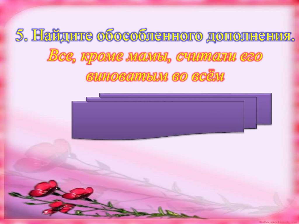 5. Найдите обособленного дополнения.Все, кроме мамы, считали его