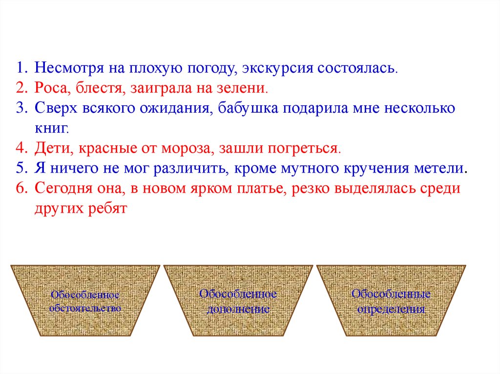 1. Несмотря на плохую погоду, экскурсия состоялась.2. Роса, блестя, заиграла на зелени.