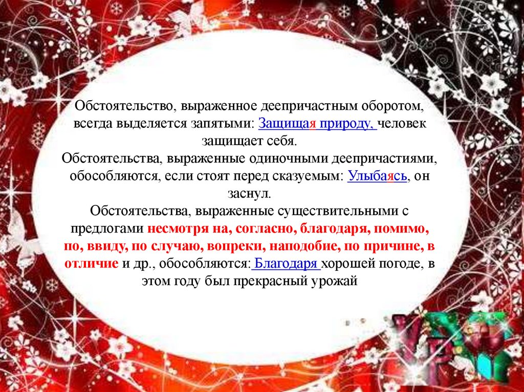 Обстоятельство, выраженное деепричастным оборотом,всегда выделяется запятыми: Защищая природу, человек