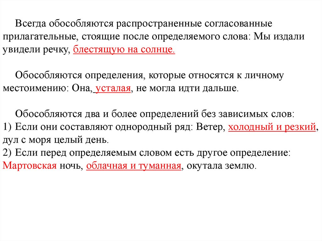 Всегда обособляются распространенные согласованныеприлагательные, стоящие после определяемого слова: Мы издали
