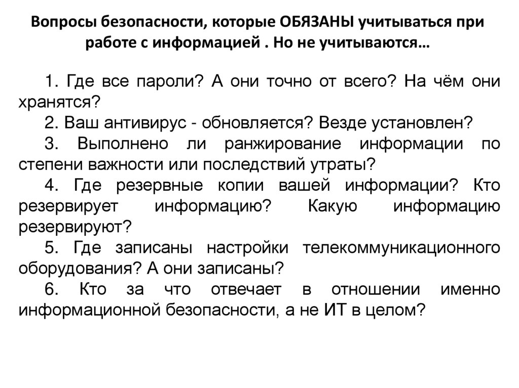 Вопросы безопасности, которые ОБЯЗАНЫ учитываться приработе с информацией . Но не учитываются…