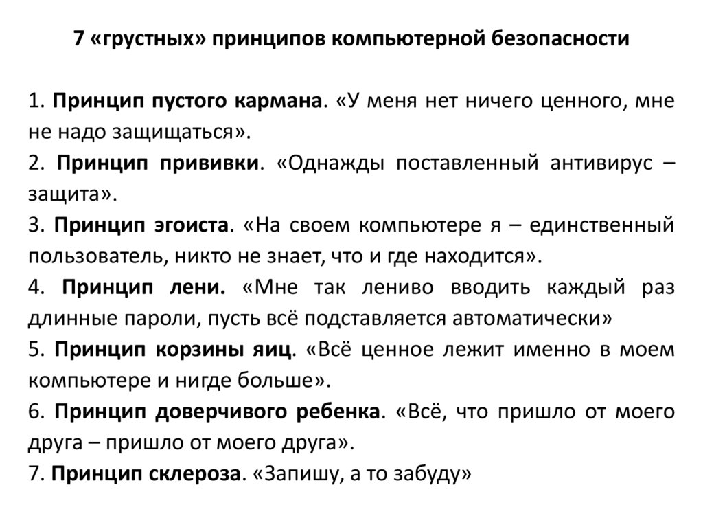 7 «грустных» принципов компьютерной безопасности1. Принцип пустого кармана. «У меня нет ничего ценного, мне