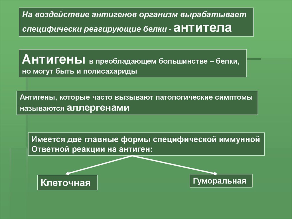 На воздействие антигенов организм вырабатываетспецифически реагирующие белки - антитела