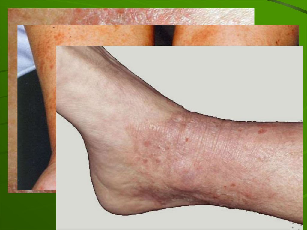 Кожа сухая, с участками шелушения,пигментации, инфильтрации и лихенизации.