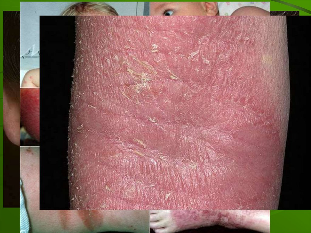 Кожа в очагах поражения:сухая, на высоте процесса можно различить 3