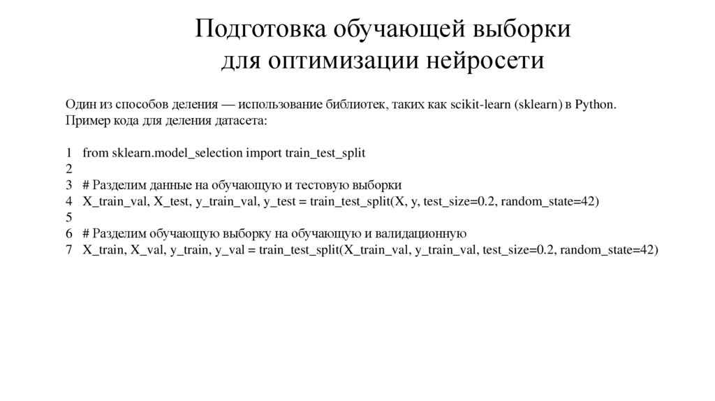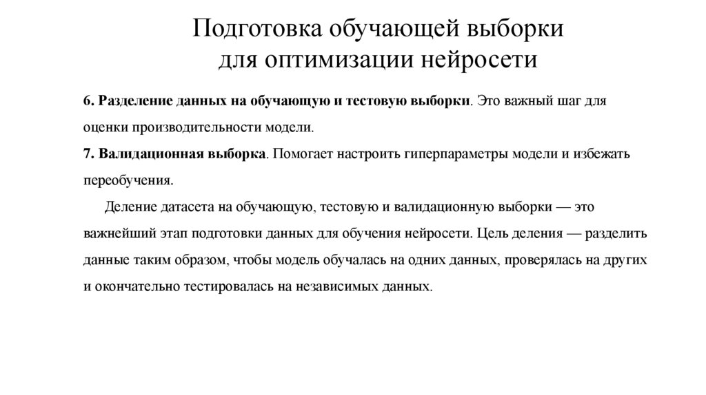 важнейший этап подготовки данных для обучения нейросети. Цель деления — разделить
