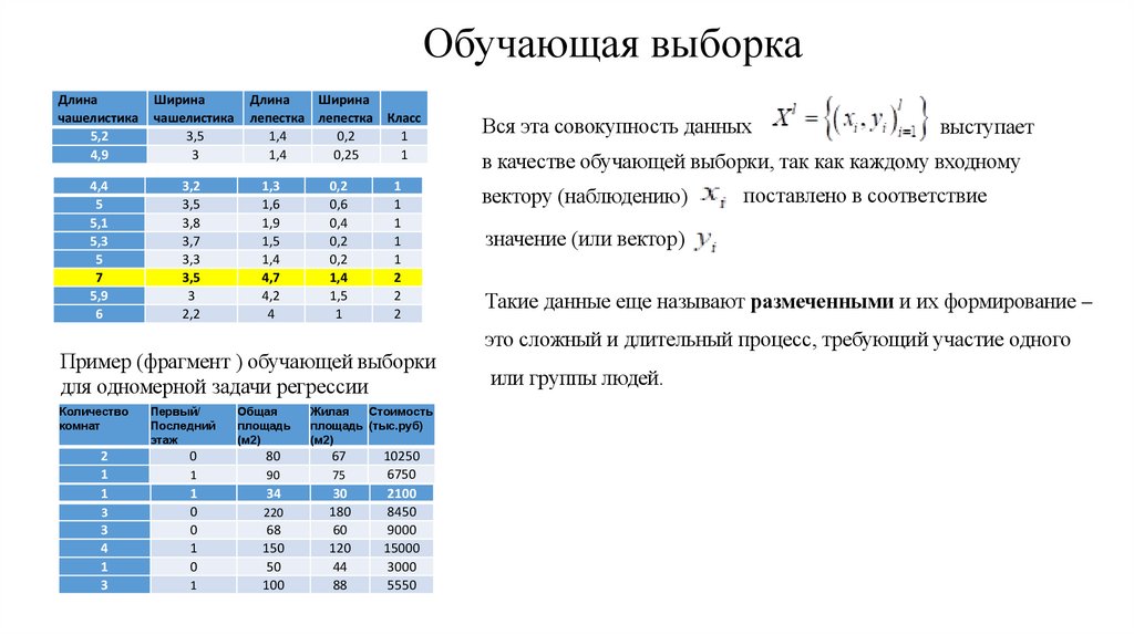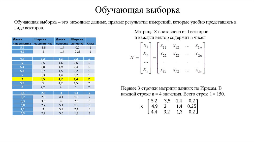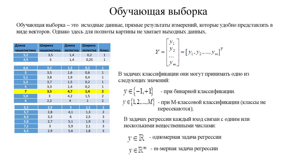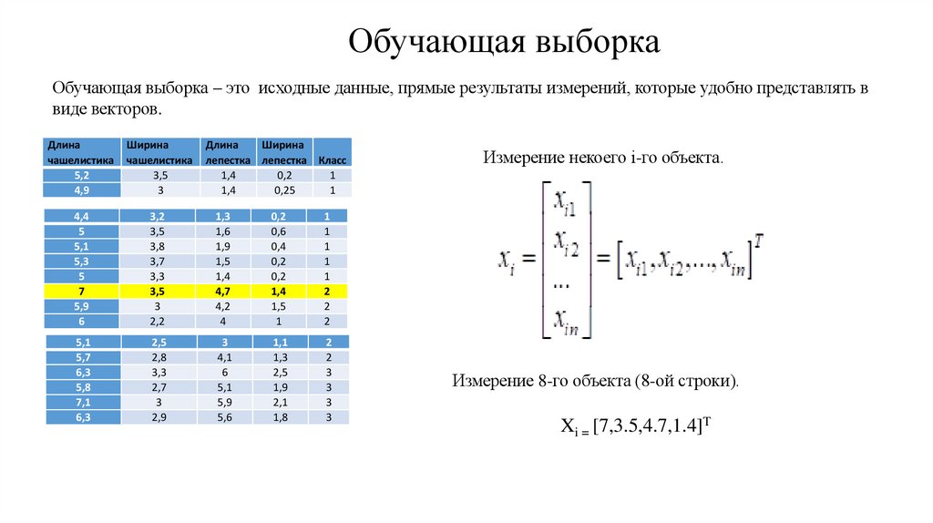 Обучающая выборкаОбучающая выборка – это исходные данные, прямые результаты измерений, которые удобно представлять в