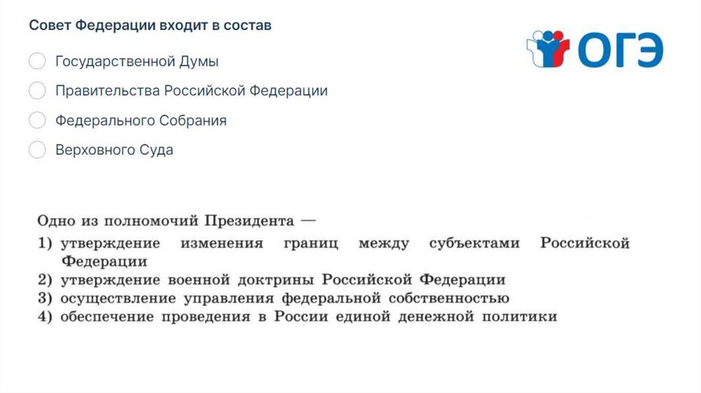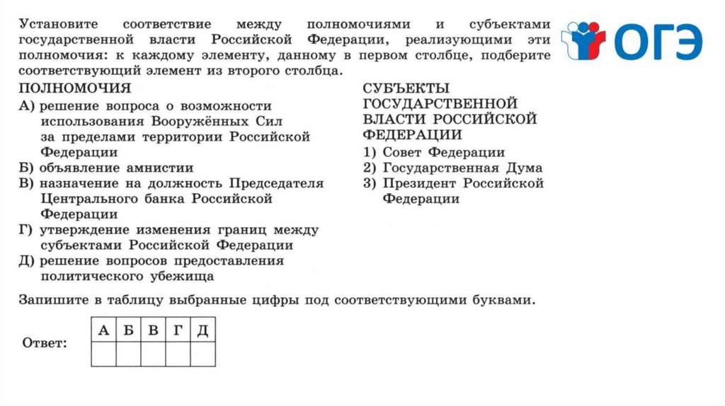 Используя Конституцию РФ (главы 4-6, особоевнимание на ст. 102, 103, 114), и задания ОГЭ и
