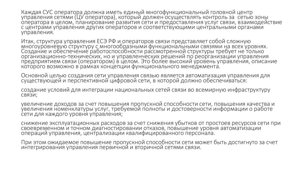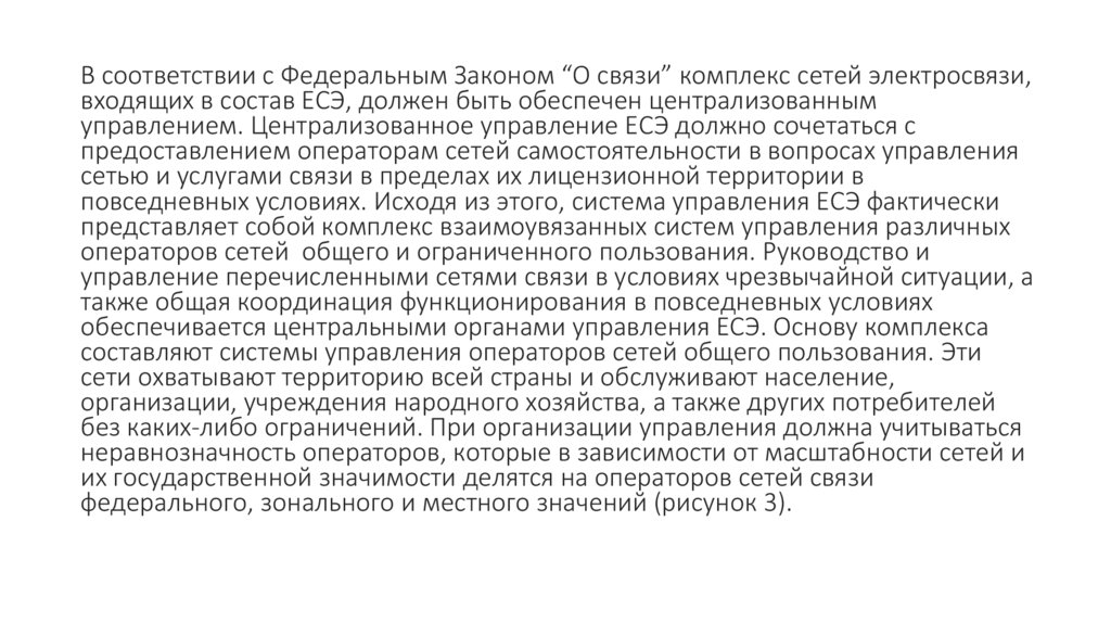 В соответствии с Федеральным Законом “О связи” комплекс сетей электросвязи,входящих в состав ЕСЭ, должен быть обеспечен централизованным