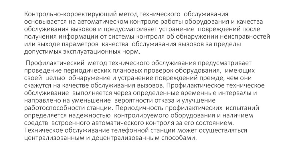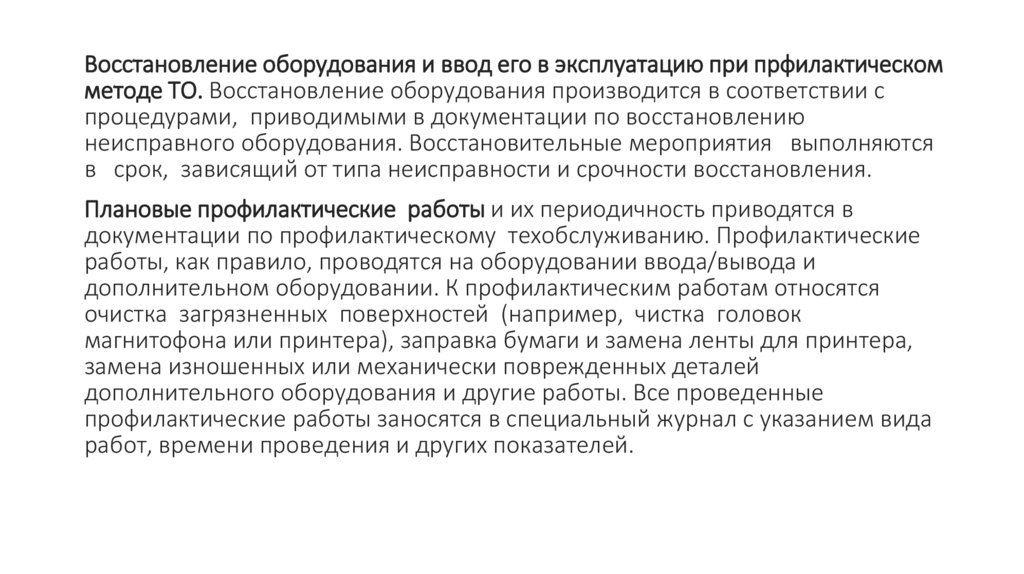 Профилактический метод технического обслуживания включает: плановый контрольработоспособности оборудования; анализ и регистрацию результатов планового контроля