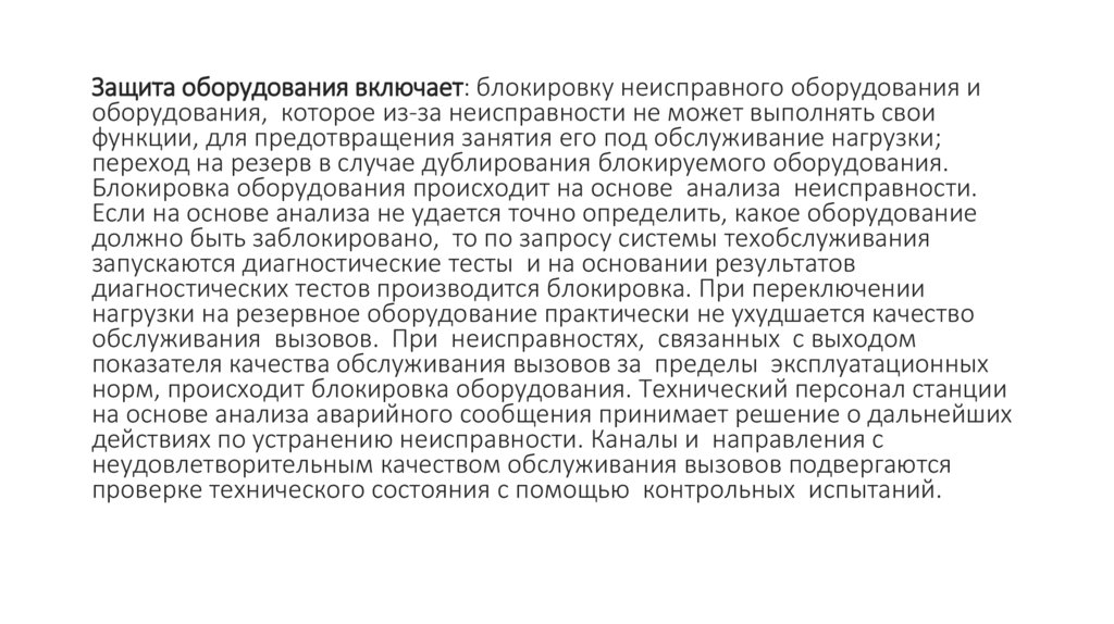 Защита оборудования включает: блокировку неисправного оборудования иоборудования, которое из-за неисправности не может выполнять свои