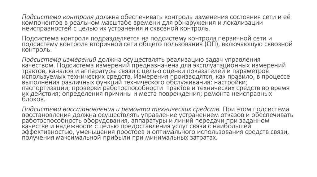 В системе технической эксплуатации выделяют ряд подсистем, таких какподсистема контроля, измерений и резервирования, расчетов и др.