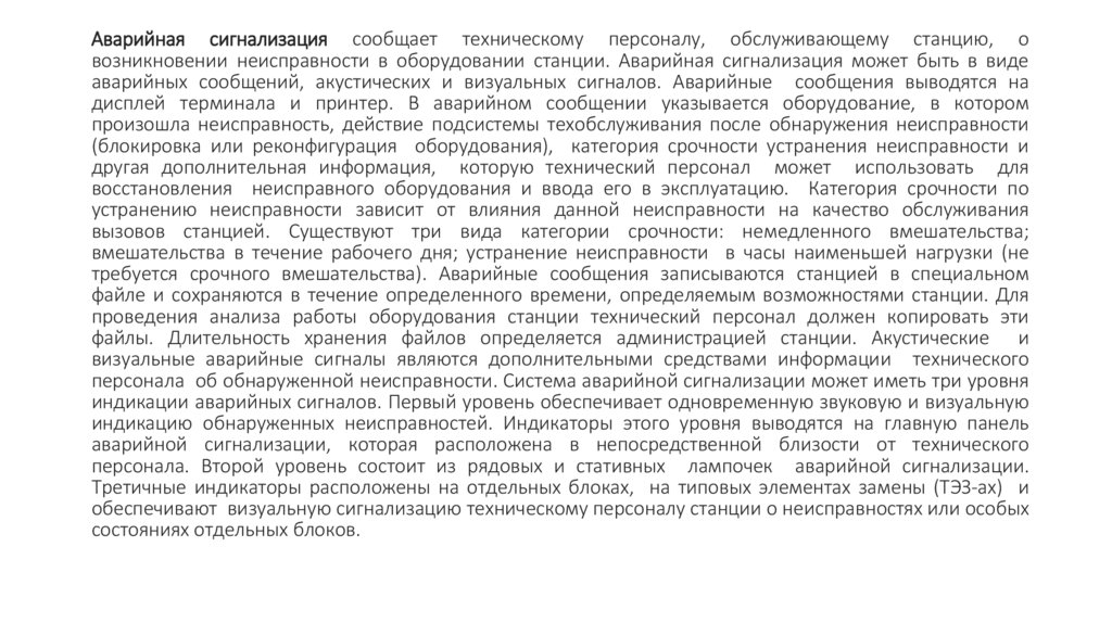 Аварийная сигнализация сообщает техническому персоналу, обслуживающему станцию, овозникновении неисправности в оборудовании станции. Аварийная сигнализация может быть в виде