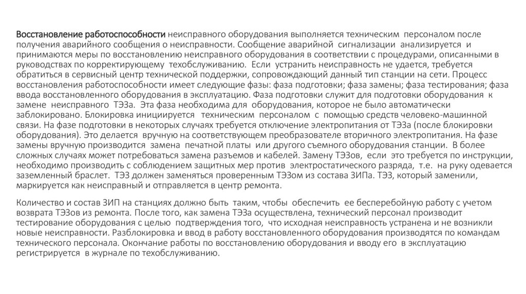 Восстановление работоспособности неисправного оборудования выполняется техническим персоналом послеполучения аварийного сообщения о неисправности. Сообщение аварийной сигнализации анализируется и