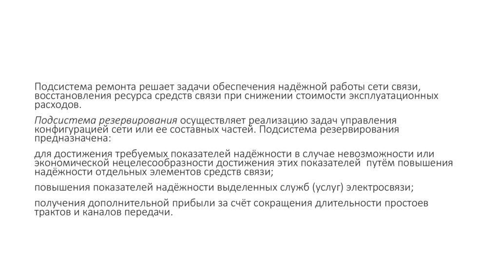 Подсистема ремонта решает задачи обеспечения надёжной работы сети связи,восстановления ресурса средств связи при снижении стоимости эксплуатационных