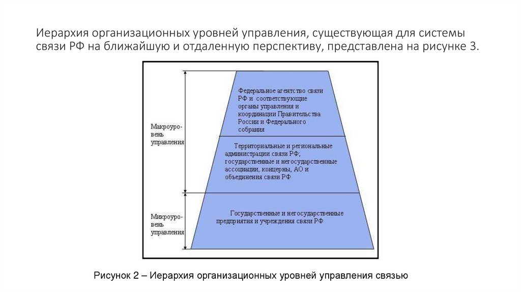 Иерархия организационных уровней управления, существующая для системысвязи РФ на ближайшую и отдаленную перспективу, представлена на рисунке 3.