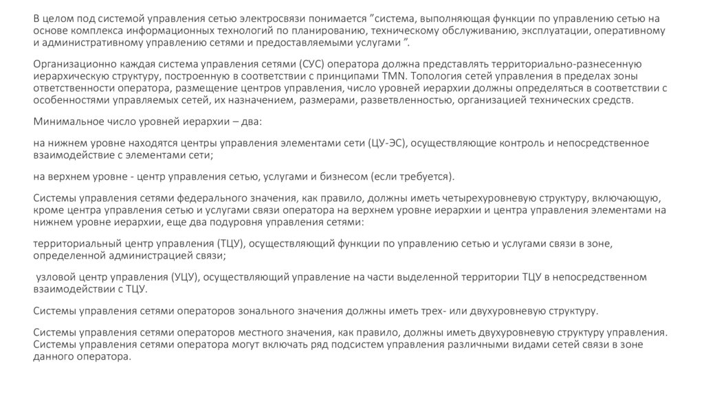 В целом под системой управления сетью электросвязи понимается ”система, выполняющая функции по управлению сетью наоснове комплекса информационных технологий по планированию, техническому обслуживанию, эксплуатации, оперативному
