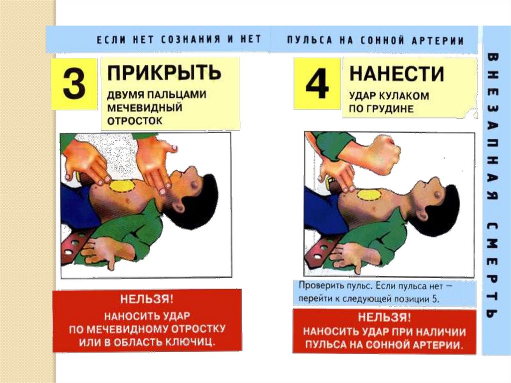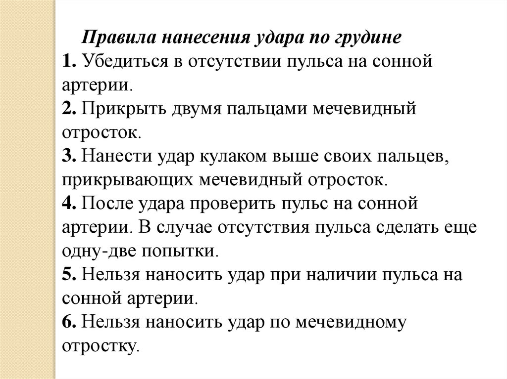 Правила нанесения удара по грудине1. Убедиться в отсутствии пульса на сонной