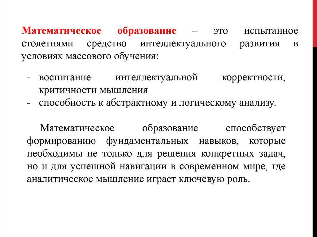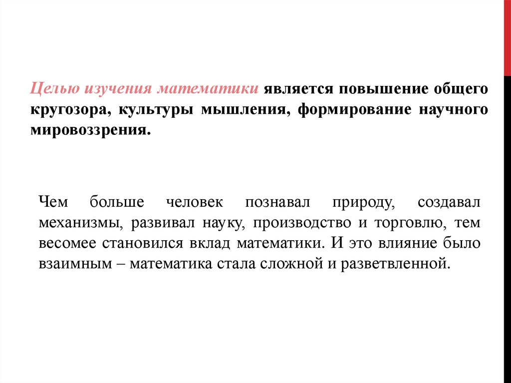 Целью изучения математики является повышение общегокругозора, культуры мышления, формирование научного
