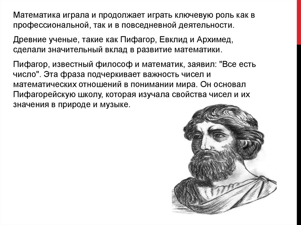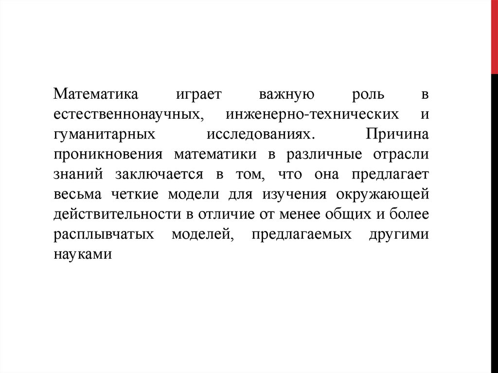 Математика играла и продолжает играть ключевую роль как впрофессиональной, так и в повседневной деятельности.
