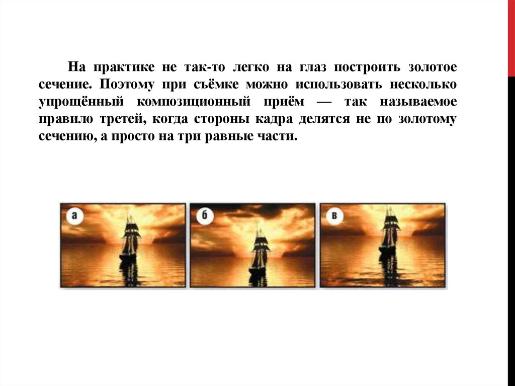 На практике не так-то легко на глаз построить золотоесечение. Поэтому при съёмке можно использовать несколько