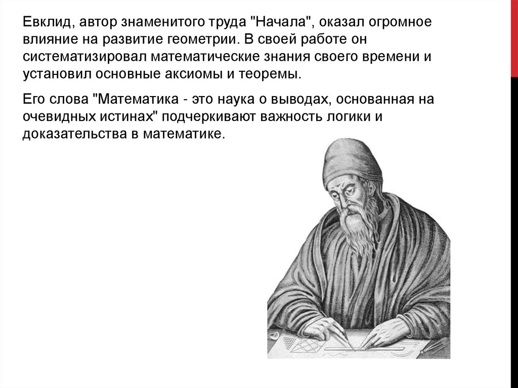 Евклид, автор знаменитого труда "Начала", оказал огромноевлияние на развитие геометрии. В своей работе он