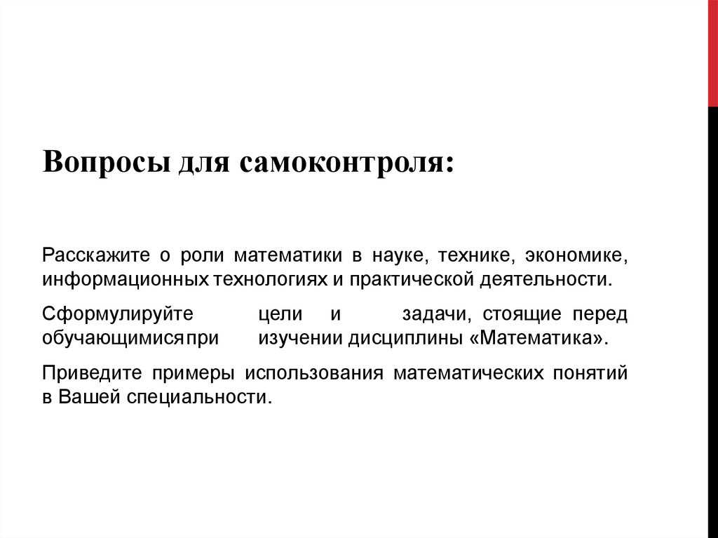 Вопросы для самоконтроля:Расскажите о роли математики в науке, технике, экономике,
