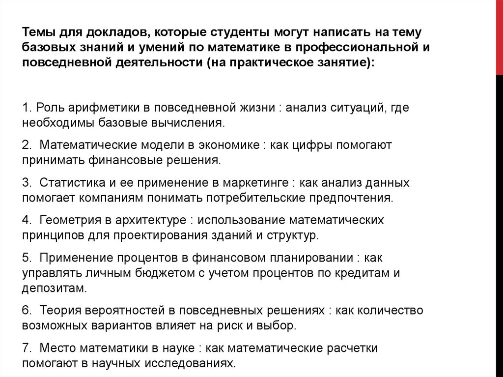 Темы для докладов, которые студенты могут написать на темубазовых знаний и умений по математике в профессиональной и
