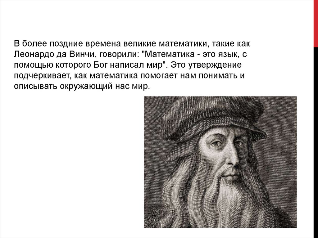 В более поздние времена великие математики, такие какЛеонардо да Винчи, говорили: "Математика - это язык, с