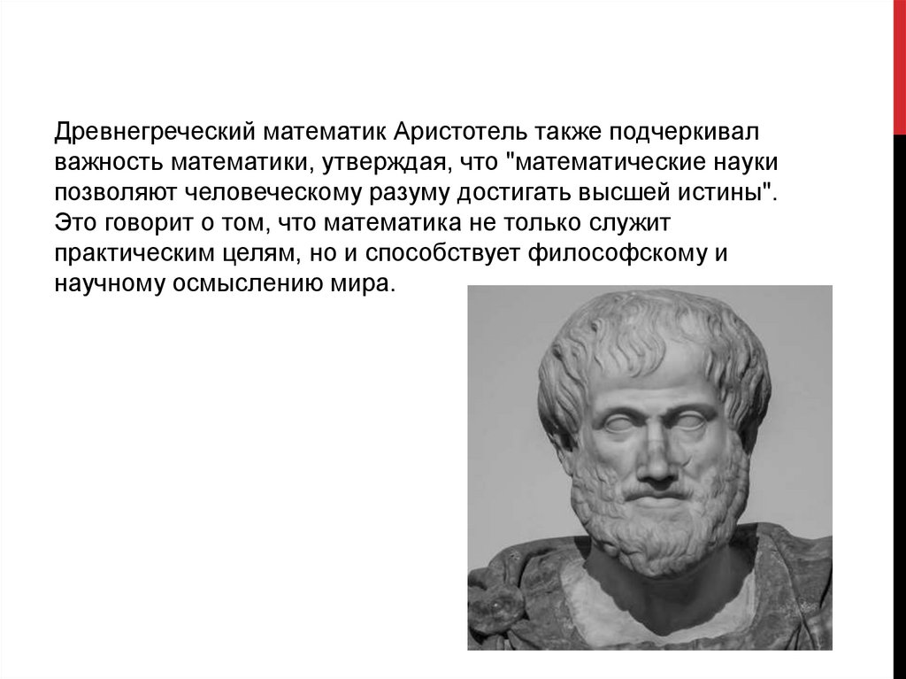 Древнегреческий математик Аристотель также подчеркивалважность математики, утверждая, что "математические науки