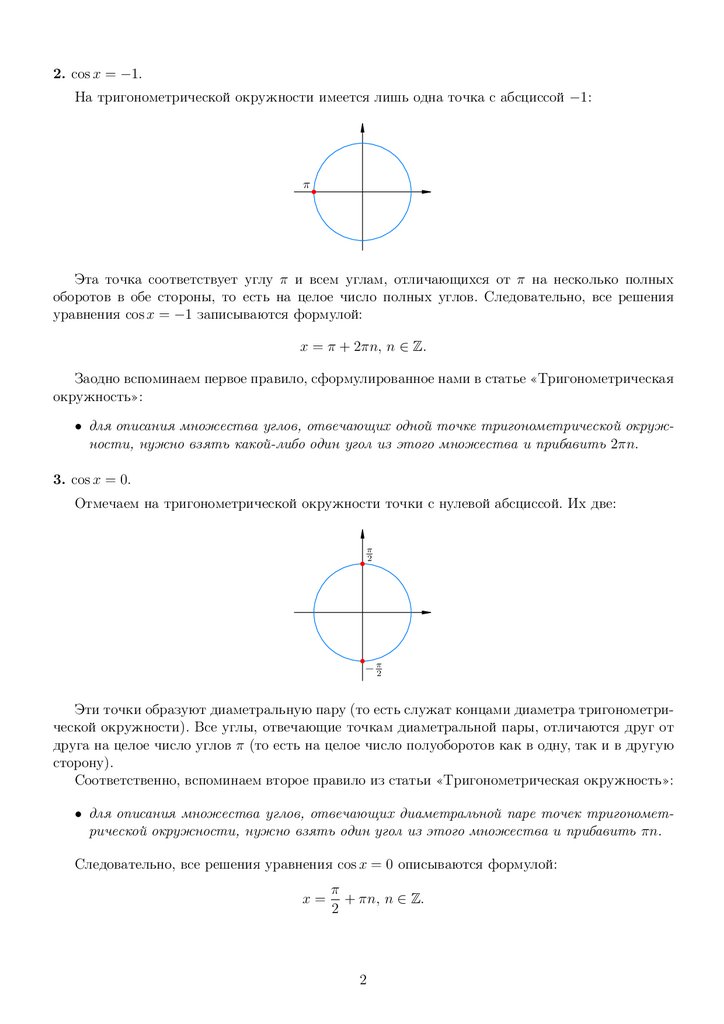 2. cos x = −1.На тригонометрической окружности имеется лишь одна точка с абсциссой −1: