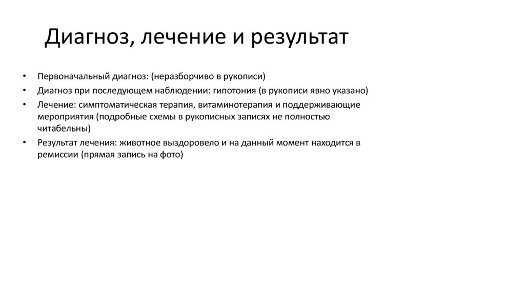 Диагноз, лечение и результатПервоначальный диагноз: (неразборчиво в рукописи)