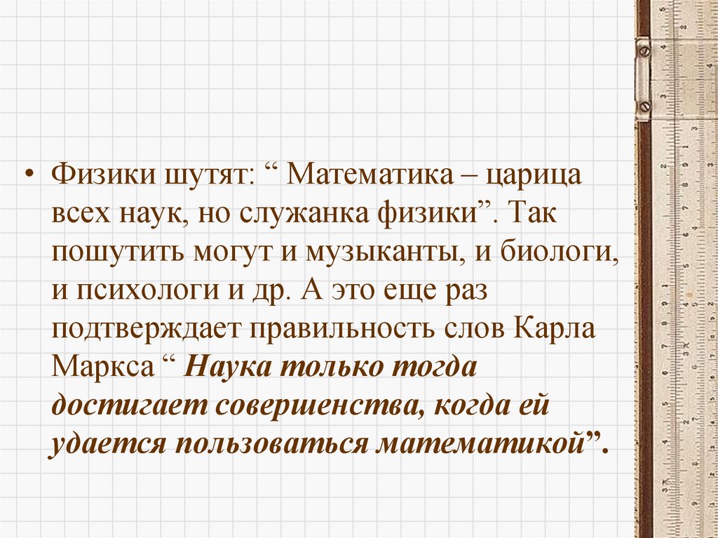• Физики шутят: “ Математика – царицавсех наук, но служанка физики”. Так